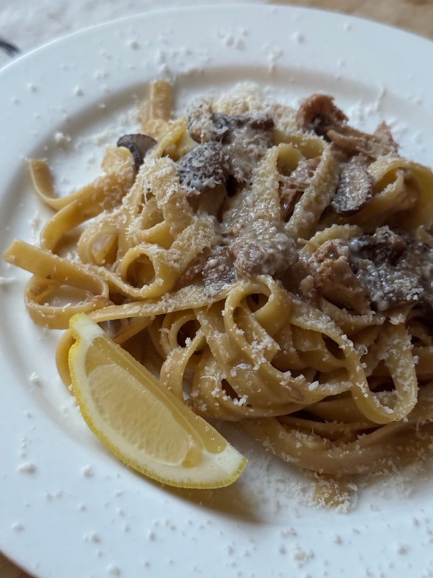 Italian-American classics offer comfort in the darkest days of winter. My desire was to create a sauce, rich and complex with a suggestion of depth and efficiency in mind. Welcome, chicken Marsala ragù. Chicken thighs caramelize in a dutch oven creating a base for thinly sliced cremini mushrooms to be cooked in. In a stroke of genius I remembered that soy sauce bolsters the natural umami in mushrooms, while fish sauce heightens meatiness. I’ve replaced any cream or starchy roux with crème fraîche. A generous amount of black pepper at the end rounds everything out and I insist on serving the pasta with a wedge of lemon countering the absence of daylight.