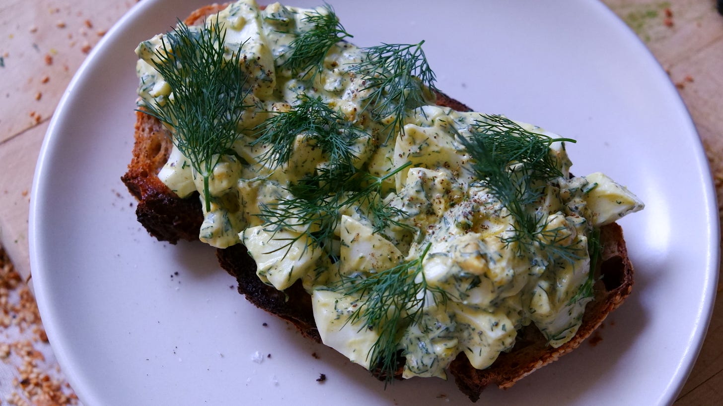 If you’re thinking, all this, for toast? I welcome you to kindly unsubscribe. A humble loaf of bread deserves the adornment and elevation we give to so many other things. There is plenty of bad toast in the world. I want to promote the happiest life one could have by making phenomenal toast. If anything, there’s a great egg salad recipe here. I would argue, the fewer ingredients, the more mindful the approach.